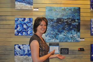 Here’s JeMA in front of her seaside pictures that hang in my favorite writing spot, the Coco Moon coffee shop.