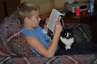 One of my favorite things to do with my sons is read.  We still read a picture book when I’m in the mood even though they’re 10, 10, 12, and 16.  When the Skippy John Jones books came out, my boys gathered on the bed together as the oldest read aloud, and the others clapped along to the interactive part.  Even Miss Matilda (cat) wanted in on the action.  (She’s trying to figure out if Curious George is more curious than she is.)