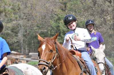 He learned how to approach and catch a horse, lead him, and brush him.  Then, the kids went on a trail ride.  Smiles, smiles everywhere!