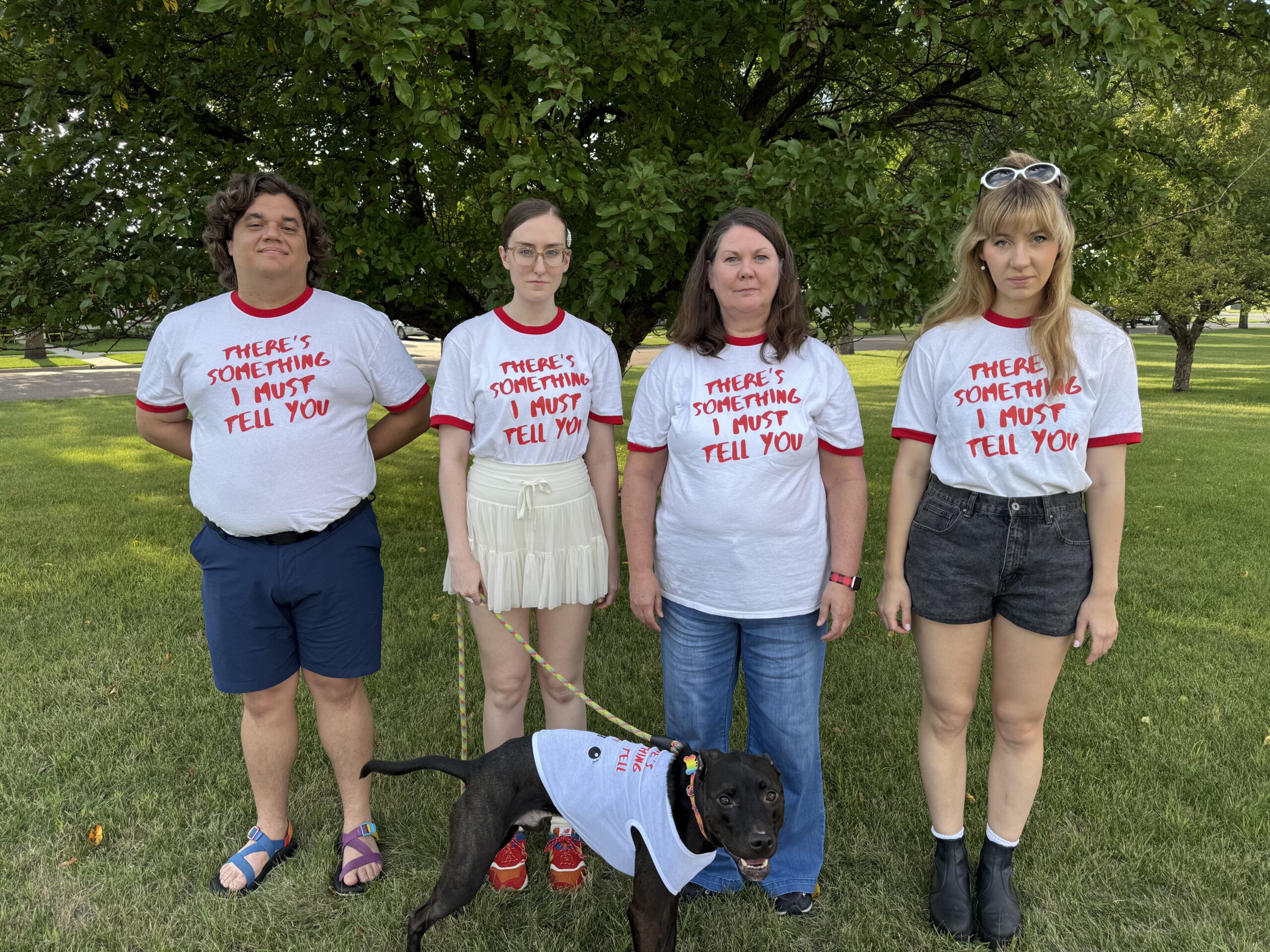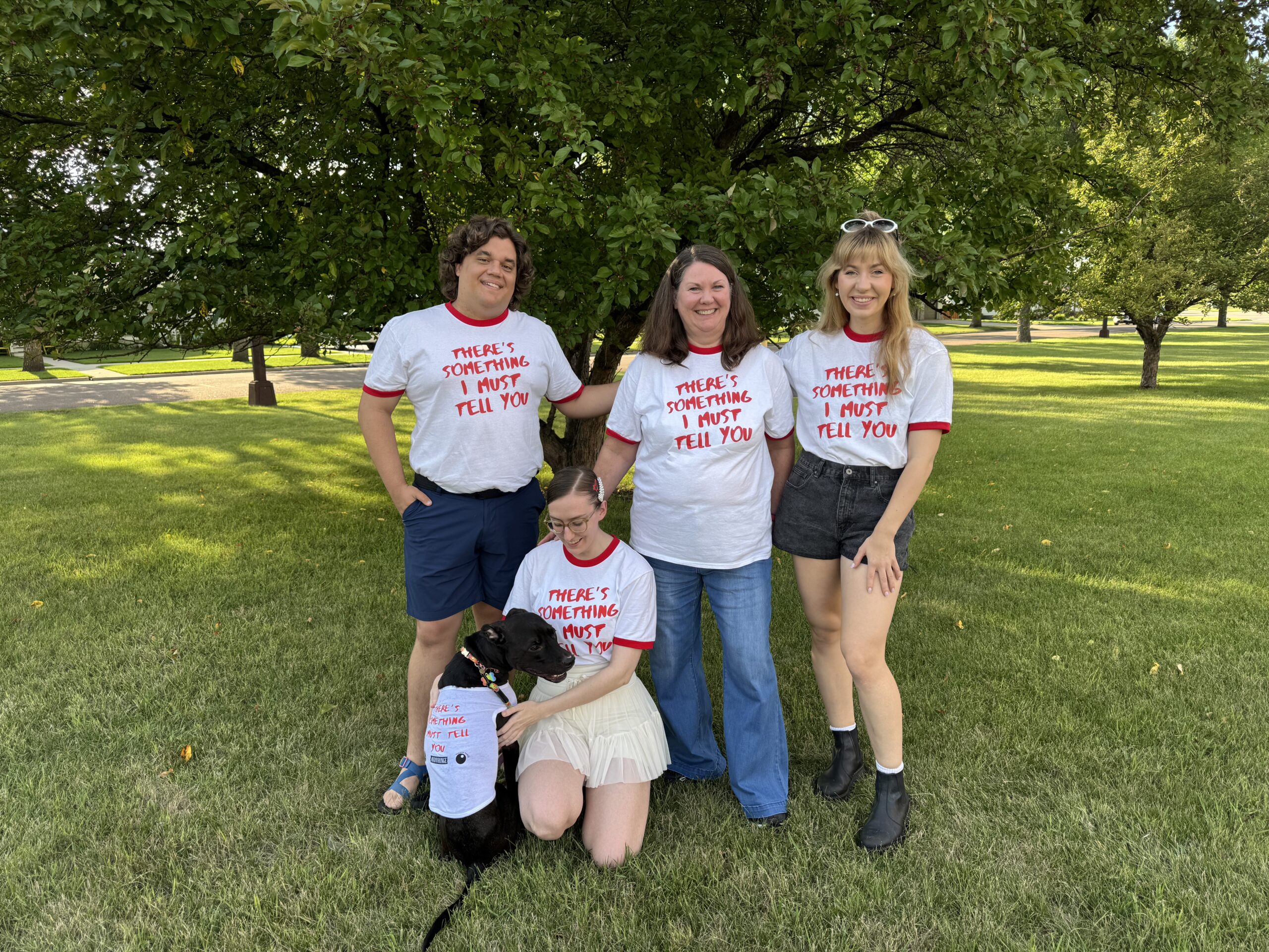 Jace Erickson, Mary Aalgaard, Juliet Wolfe, Ashley Fredericksen and our mascot George in the Fringe show “There’s Something I Must Tell You” by Kathleen Coudle-King. On tour August 2025